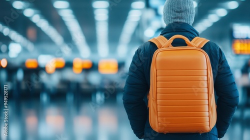 A traveler stands in an airport, wearing a stylish orange backpack, ready for adventure with destinations ahead.