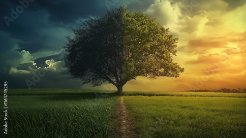 A tree is shown in two different colors, one side is green