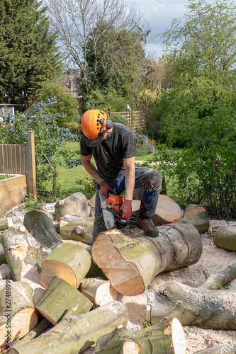 A tree Surgeon or Arborist uses a chainsaw to cut up a felled tree. He is wearing safety equipment