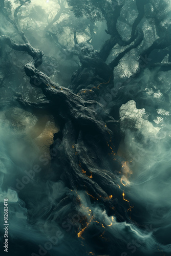 A tree with a lot of smoke coming out of it