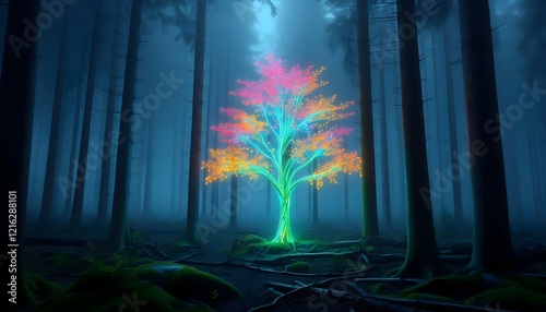 A tree with glowing neon-colored leaves in the middle of a foggy forest, representing abnormality in plant life