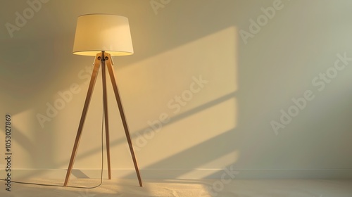 A tripod floor lamp with a white shade on a light wall with window shadows.