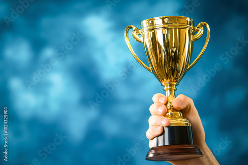 A triumphant hand lifts a shining gold trophy against a bold blue background. The bright gold