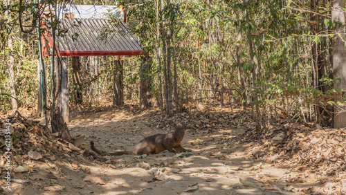 A unique animal- endemic to Madagascar- fossa sits on a dirt path in the forest. Shiny brown fur, long tail, eyes, ears, nose are visible. Kirindy Forest.