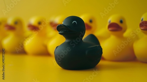 A unique black rubber duck stands out among cheerful yellow ducks in a vibrant arrangement. Playful and fun decor for all ages.