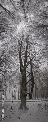 A unique tree formation where two trunks appear fused, standing in a foggy winter forest covered with fresh snow. Symbol of resilience, survival and natural adaptation.