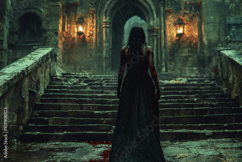 A vampire bride in a blood-soaked gown emerging from a crypt on Halloween night captures the essence of gothic horror. Concept of fear.