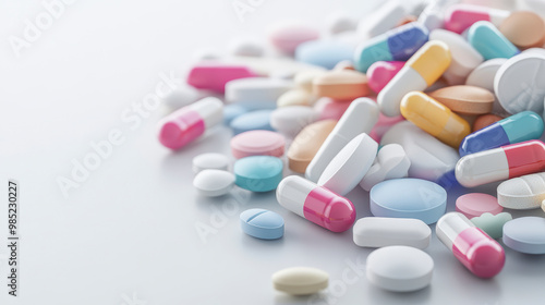 A variety of colorful pills and capsules scattered on a white surface, representing different types of medications or supplements.