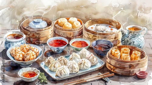 A variety of delicious dim sum dishes are on display, including dumplings, buns, and rolls
