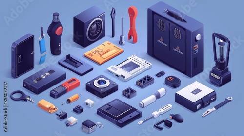 A variety of electronic devices and accessories in an isometric view on a blue background.