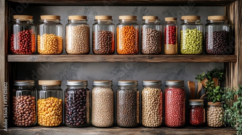 A variety of legumes stored in glass jars on a kitchen shelf, Main keyword legumes, Concept organized pantry