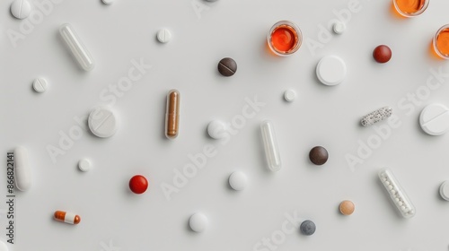A variety of pills and capsules scattered on a white background. This image could represent a concept of healthcare or medicine.