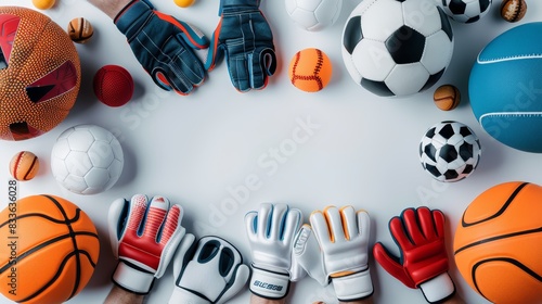 A variety of sports equipment including balls, gloves, and a net.