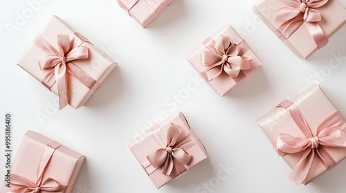 A various colorful gift boxes pink red ribbon over the white background, birthday theme on white background , Gifts in gold packaging on a white background with place for text