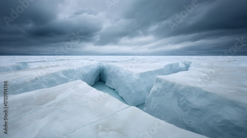 A vast Antarctic glacier with a massive, geometric blue void in the ice, under a troubled, melancholic sky.