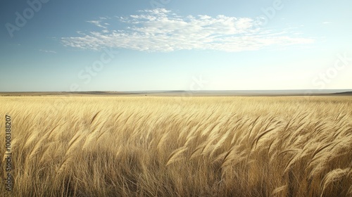 A vast field of golden wheat swaying gently in the wind under a clear blue sky.