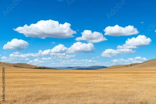 A vast golden wheat field swaying under a bright blue sky with fluffy white clouds