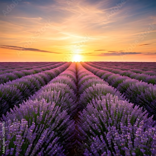 A vast lavender field with purple flowers glowing under a peach-colored sunset sky, Ai Generated