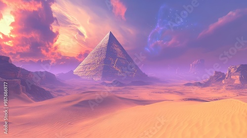 A vast, magical desert with glowing sand dunes and an ancient, floating pyramid hovering in the distance.
