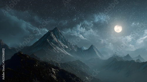 A vast mountain range under a night sky with a bright full moon illuminates the rocky peaks. Starry constellations are present in the dark, cloudy background.