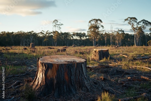 A vast open landscape, post-deforestation, displaying numerous tree stumps scattered across an expansive field, reflecting human impact on nature.