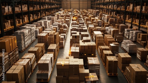 A vast warehouse filled with neatly arranged cardboard boxes on shelves, showcasing efficient storage solutions in a well-organized environment.