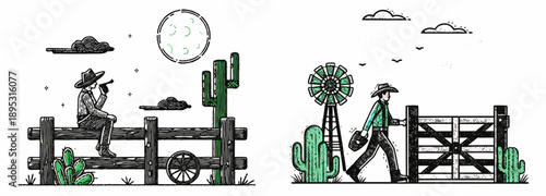 A vector graphic illustration of two cowboys in a western landscape with cacti and a windmill