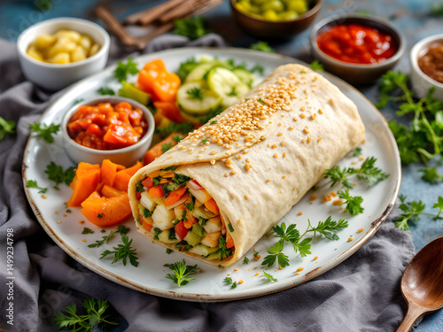 A veggie wrap on a plate with various sauces and vegetables in bowls and a wooden spoon on the side