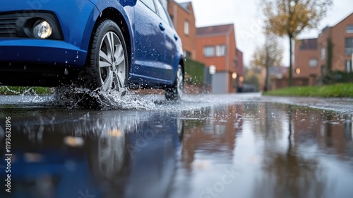A vehicle drives through heavy rain, splashing water from its front wheel on a busy expressway on a sunny day.