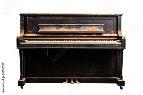 A very old black piano, vintage, honky tonk, saloon, isolated or white background