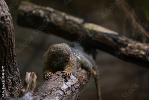 A very small pygmy marmoset is lying face down on a rough, textured branch. Its dense brown-grey fur is visible, and its small face is turned slightly to the side