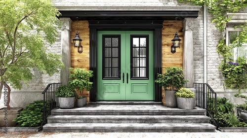 A vibrant 3D rendering of a mint green front door with deep wooden columns and gray stone steps