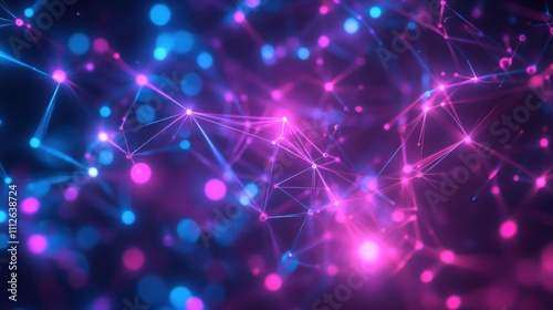 A vibrant abstract background featuring interconnected nodes in shades of pink and blue, creating a futuristic digital atmosphere.