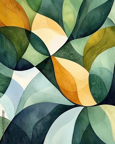 A vibrant, abstract design featuring overlapping leaf shapes in green, yellow, and blue tones, creating a soothing and harmonious visual effect.
