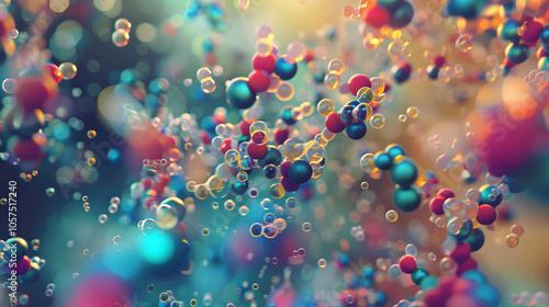 A vibrant, abstract representation of molecular structures and particles, floating in a colorful, out-of-focus background symbolizing scientific research