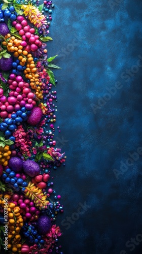 A vibrant and colorful assortment of various fruits arranged artistically against a contrasting deep blue textured background with scattered leaves and flowers.