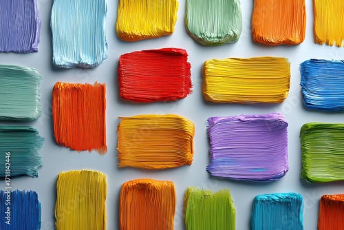 A vibrant and colorful collection of paint swatches arranged in a neat grid pattern, showcasing a wide spectrum of hues, creating an eye-catching and artistic background.