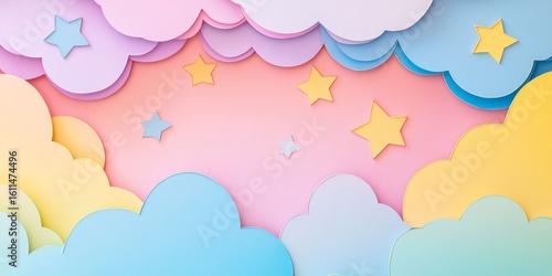 A vibrant and whimsical illustration of a pink and yellow sky filled with fluffy clouds and sparkling stars. Ideal for children's books or playful designs.