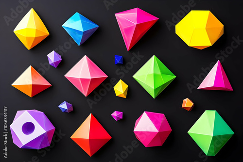A vibrant arrangement of geometric shapes in various colors on a dark background.