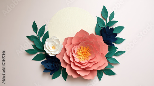 A vibrant arrangement of paper flowers in various colors and shapes, accented by green leaves, set against a soft background.