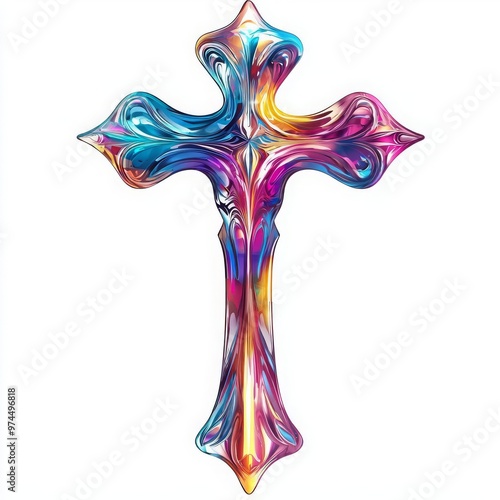 A vibrant, artistic cross design featuring a swirl of colors that symbolize faith and spirituality.
