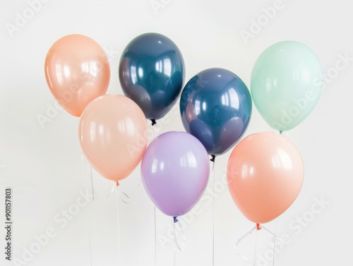 A vibrant assortment of balloons in navy, mint, coral, peach, and lavender ready for festivities