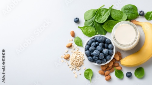 A vibrant assortment of healthy ingredients, including spinach, blueberries, oats, almonds, banana, and a jar of milk, arranged attractively on a light background.