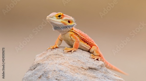 A vibrant bearded dragon perched on a rock, basking in warm sunlight against a blurred backdrop