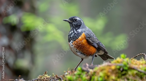 A vibrant bird perched on a mossy log in a lush forest, showcasing nature's beauty and tranquility