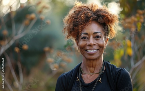 A vibrant black African woman beams with joy while standing outdoors in a natural setting, illuminated by the soft light of early morning