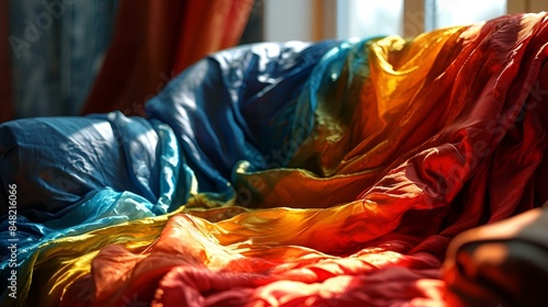 A vibrant blanket adorns a couch, adding a pop of color to the room's decor.