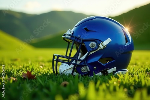 A vibrant blue football helmet rests peacefully on a lush green field, bathed in the golden glow of sunset, signifying the end of a game or the anticipation of a new beginning.