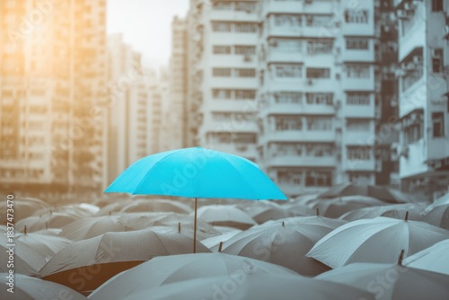 A vibrant blue umbrella stands out atop a cluster of gray umbrellas in a bustling cityscape, illuminated by soft, diffused sunlight, evoking a sense of security and optimism