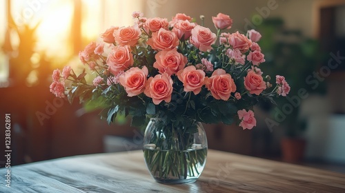 A vibrant bouquet of pink roses in a glass vase on a wooden table with soft sunlight streaming in